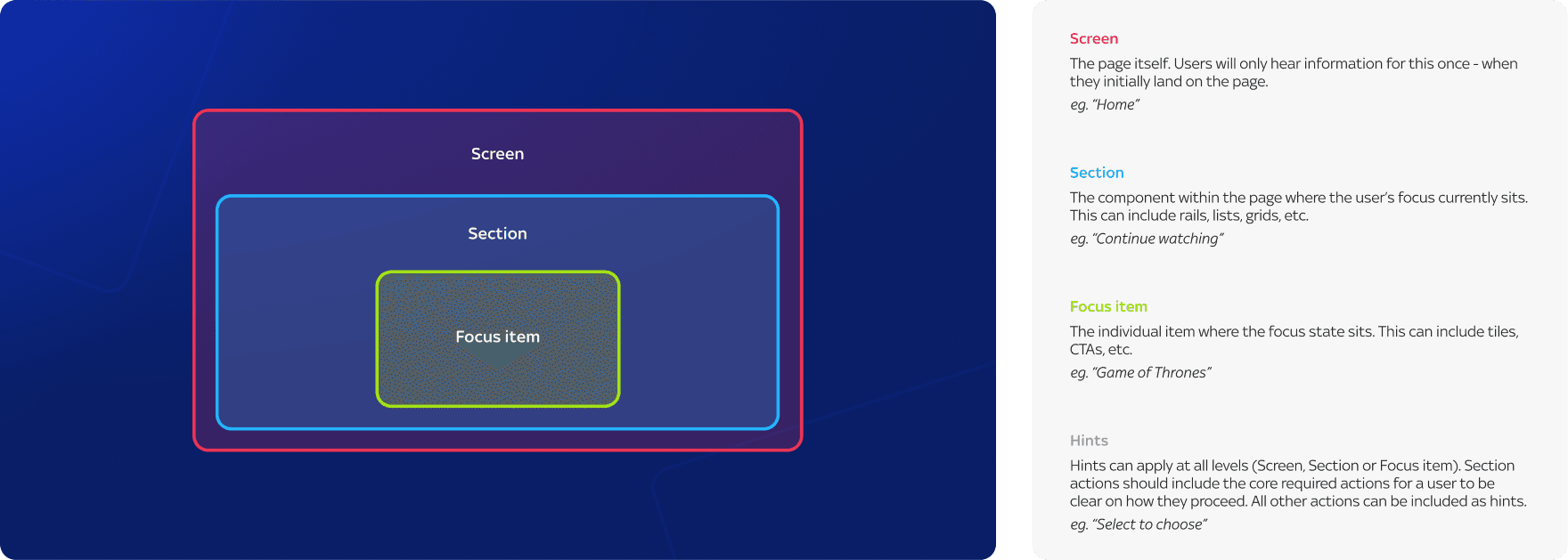 The framework below standardises voice guidance documentation across all TV products, ensuring consistency in structure and terminology. It helps define content hierarchy, aligning with familiar patterns users expect across Sky’s TV ecosystem.