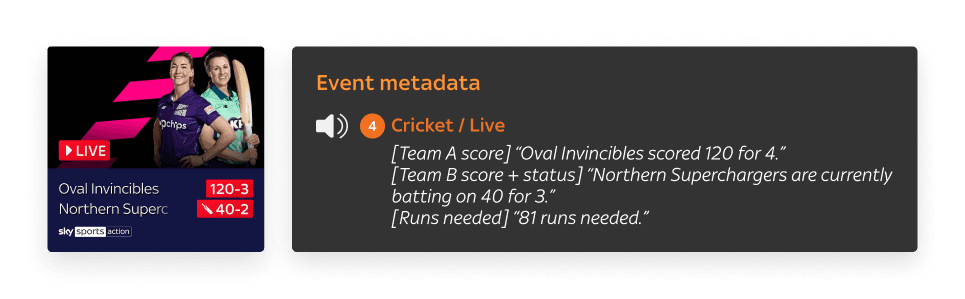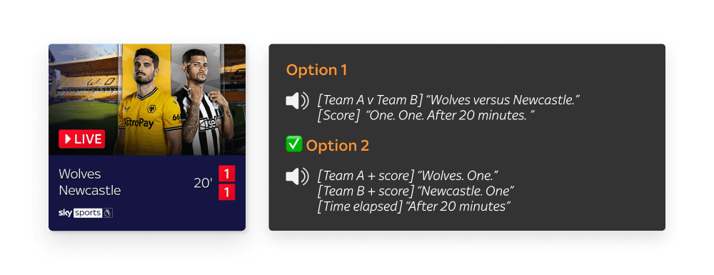 For the Sky Sports TV app, voice guidance scripts were needed to ensure an accessible experience for users with visual impairments. This technology, similar to VoiceOver (iOS) and TalkBack (Android), provides spoken feedback for on-screen content. The scripts needed to align with accessibility guidelines while being clear, meaningful, and contextually relevant to the nuances of the sports app.